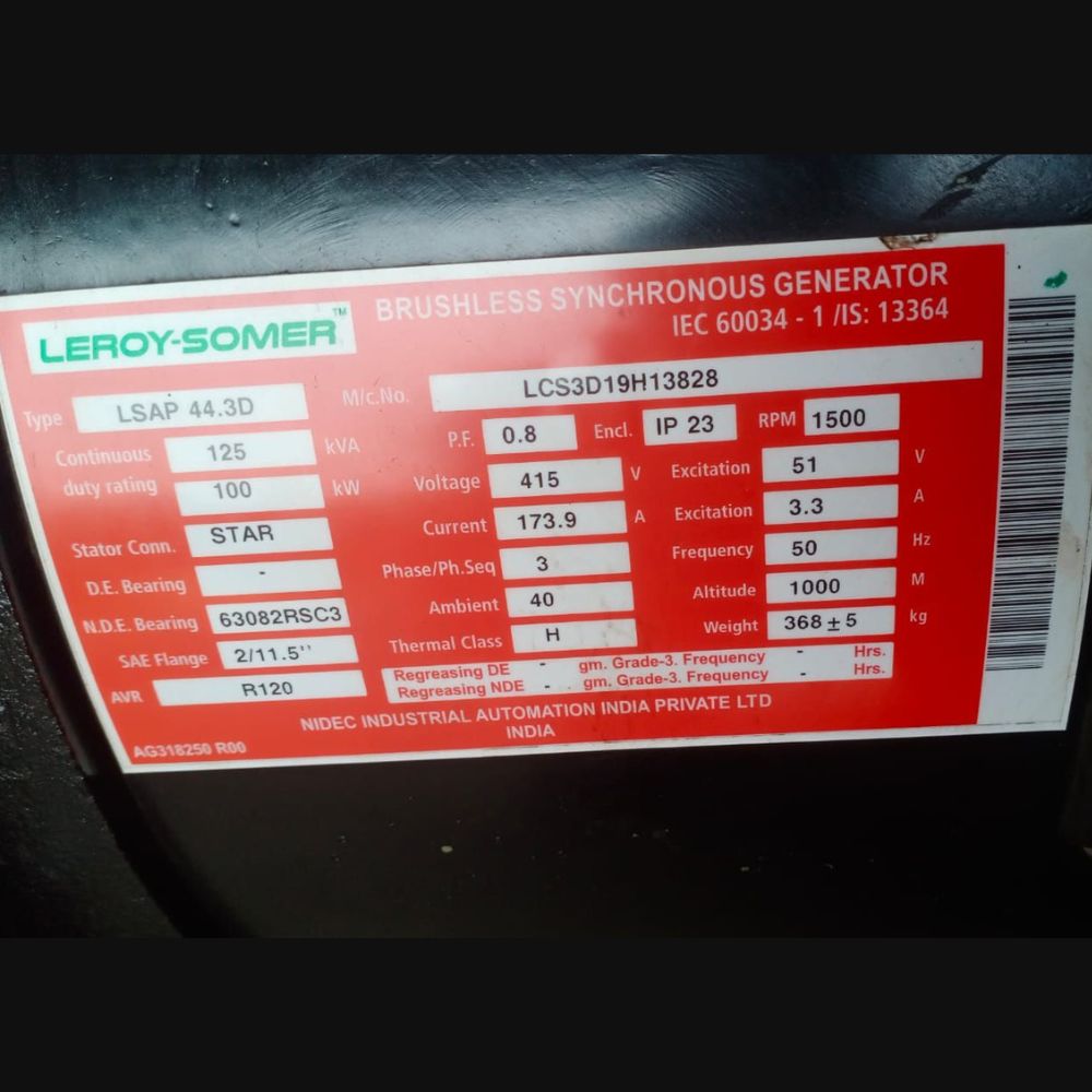 We are offering 2 Units of 125 kVA LSAP 44.3D alternators from Leroy-Somer, a globally recognized manufacturer under the Nidec Group, known for high-quality and durable power generation equipment.