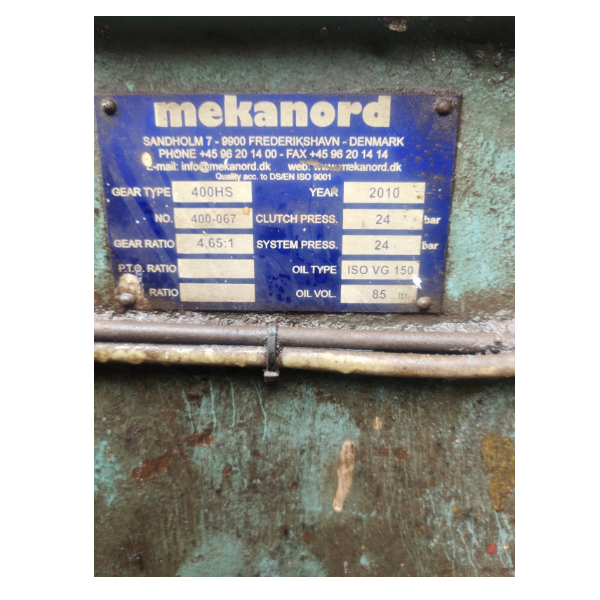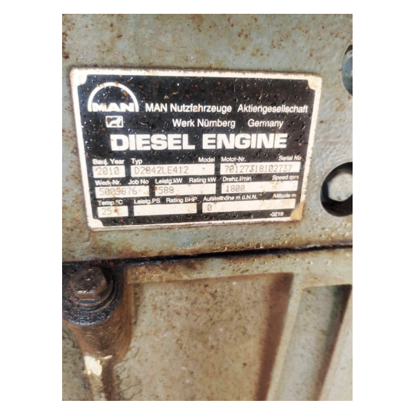 | Additional Details | Make: MAN | Model: D 2842LE 412 | Year: 2010 | Rating kW: 588 | Speed rpm: 1800 | Motor No. 70127318102737 | Mekanord 400HS Gear ratio 4,65:1 |