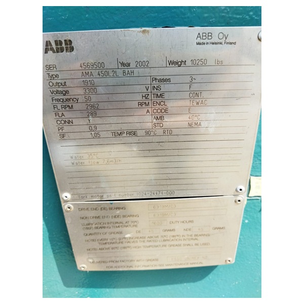 ?Additional Details | SERIAL NO: 4569500 | YEAR: 2002 | OUTPUT: 1910 | VOLTAGE: 3300 V | FREQUENCY: 50HZ | WEIGHT: 10250 LBS | FL RPM: 2962? |