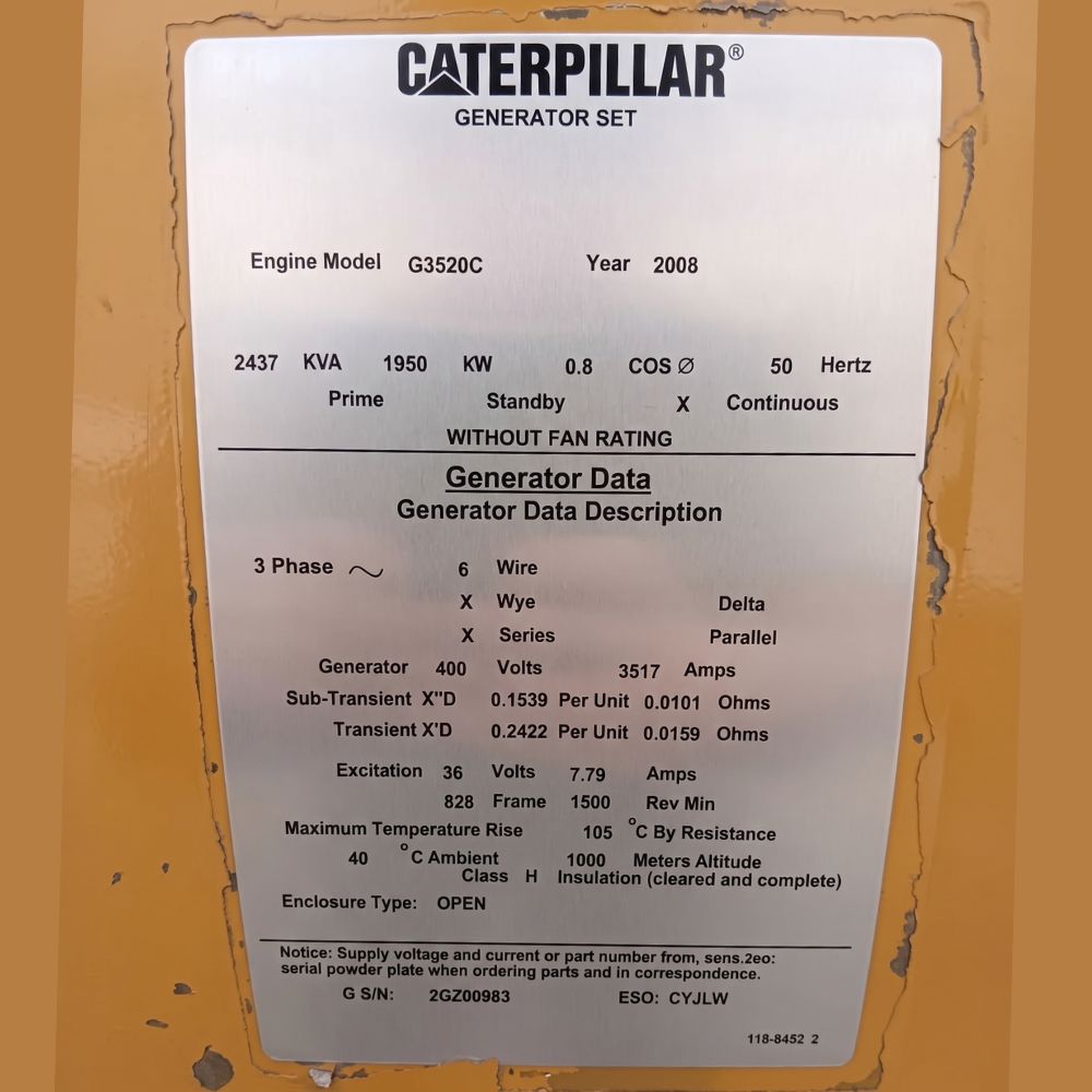 Caterpillar 2437 kVA Alternator for Sale – Ex G3520C Generator Set (Used, 2008)