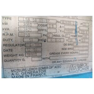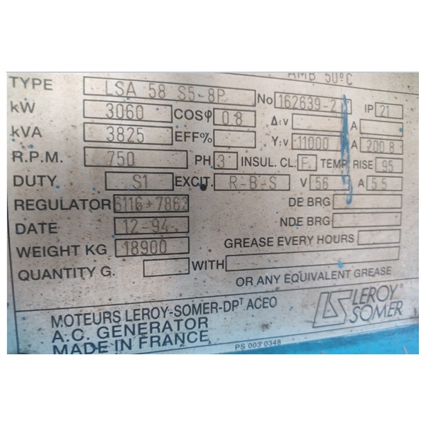 ?Additional Details | SERIAL NO: 162639-2 | YEAR:? 12 / 94 | OUTPUT:? 1910 | VOLTAGE:? 56 V / 55 A | RATING: 3060 kW / 3825 kVA | WEIGHT: 18900 KG | FL RPM: 750 |