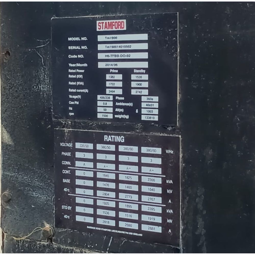 The Mitsubishi S16R 1900 kVA generator is equipped with a reliable Stamford alternator, ensuring stable voltage and efficient power generation.