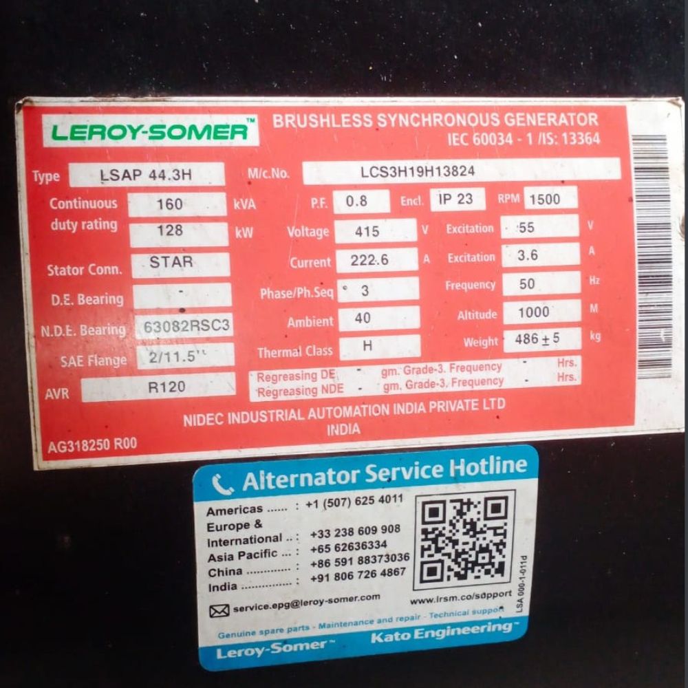 The Used 160 kVA Leroy Somer Alternator LSAP 44.3H is designed for efficient and reliable power generation. Built by Leroy-Somer, it ensures stable output and long-term durability.